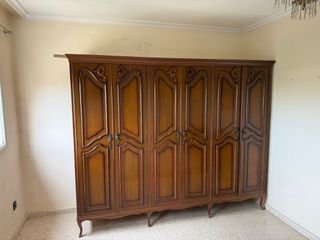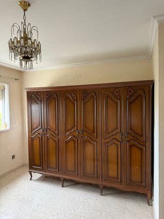 Armario ropero de madera de 4 puertas más una columna cajonera. Medidas: -Ancho: 249cm -Alto: 240cm -Fondo: 57cm ✔️ En perfecto estado, lo unico a destacar es que una de las tablas del fondo del armario izquierdo esta un poco dada de sí, se puede observar en la imagen. 🚚 Se da desmontado. Recogida en persona.