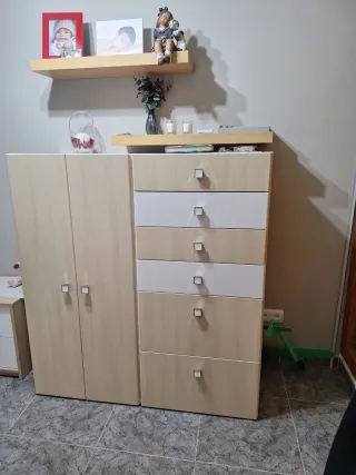 Tiene dos camas, una plegable, dos colchones de mejor calidad de los que salen en la factura, mesita de 3 cajones, cajonera con rueda y tres cajones y libreria estanteria. Para mas informacion y precio contactar por privado.