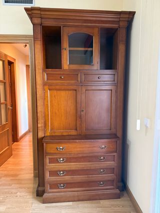 Mueble de madera con vitrina y cajonera. - Puerta de cristal con detalle arqueado. - Dos cajones inferiores. - Dos puertas con dos zonas separadas por cristal. - Cuatro cajones amplios en la base. Se tiene que venir para recoger en el domicilio. Cualquier duda, póngase en contacto.
