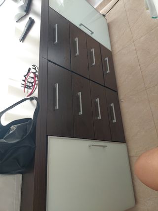 armario 5 puertas, chapa natural wengue, puertas laterales de forma curva con interior de estantes, rinconera curvada con interior de 2 estantes y barra colgador, y armario con cajonera, 2 estantes y barra colgador. Medidas del armario en la tercera foto. 240 alto x 141x198 Esta desmontado, solo es venirlo a buscar. interior de color beig. costó 2080 eur. materiales de alta calidad y altos grosores, bisagras de calidad.