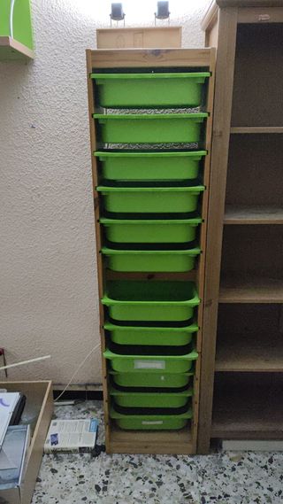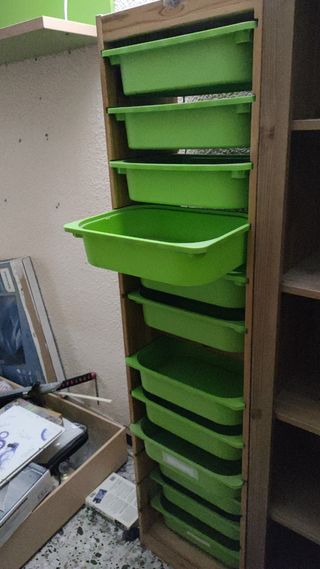 Práctica cajonera de madera con diez cajones de plástico en color verde. - Estructura de madera. - Diez cajones de plástico.