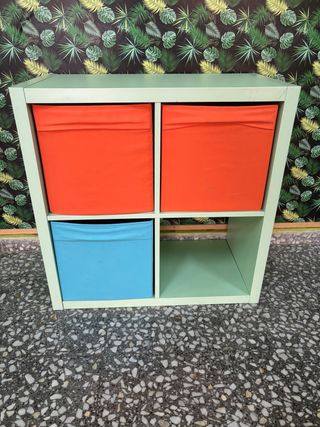 Mueble organizador con compartimentos. - Estructura de madera. - Incluye dos cubos de tela naranjas y uno azul.