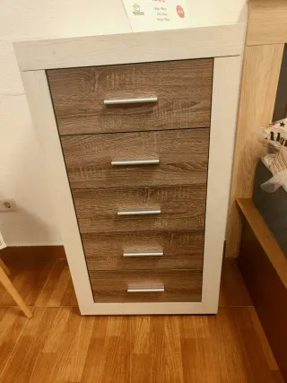 Mueble cajonera con un diseño moderno en blanco y negro. - Cinco cajones amplios. - Tiradores negros. - Estructura robusta. Tiene algún desperfecto pero se puede arreglar