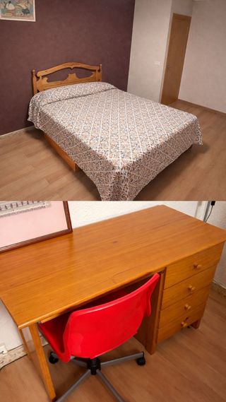 Se vende conjunto de cama y escritorio. - Cama con cabecero de madera. - Escritorio con cajonera de madera. - Silla de escritorio roja de plástico.