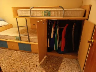 Litera funcional que combina espacio para dormir con almacenamiento integrado. - Estructura de madera y metal. - Cajoneras de color azul. - Armario con puertas. - Incluye colchones de 190x90