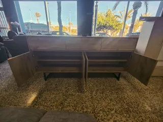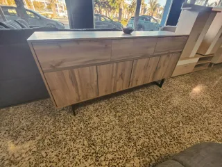 Mueble de almacenaje con un diseño moderno y funcional. - Estructura principal de madera. - Patas y detalles metálicos.