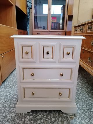 Cómoda de tres cajones con un diseño moderno y elegante. - Acabado en color blanco. - Fabricada en madera. - Tiradores dorados. El cajón último no abre aunque cierra perfecto