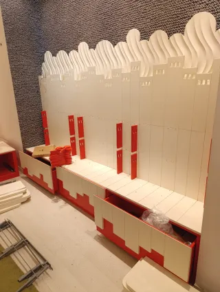 Conjunto de mobiliario para comercio, incluyendo cajoneras. - Diseño moderno en rojo y blanco. - Combinación de materiales de madera y metal. haznos tú oferta