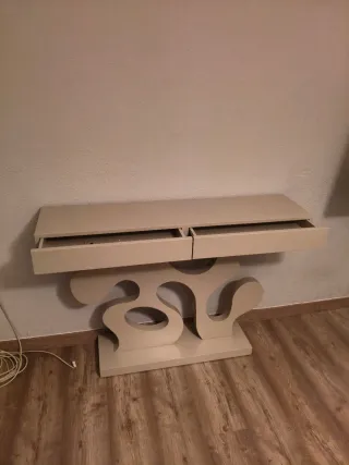 Elegante mueble de entrada con un diseño moderno y original. Cuenta con dos cajones para almacenamiento. - Diseño curvo único. - Acabado en color beige. - Fabricado en madera.