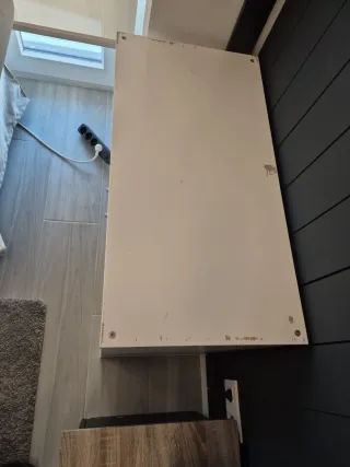 Vidrio de 1 cm de grosor para escritorio para apoyar sobre dos patas o caballetes. Se regala una pata de metal, la que venía con él, la gris. Solo hay una pata porque iba apoyado en una cajonera, nosotros lo apañamos como se ve en las fotos, con una pata blanca y una escuadra. El cristal es de muy buena calidad, pesa mucho y está muy cuidado, no tiene arañazos.