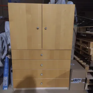 Mueble de almacenamiento con cajones y puertas. - Diseño de madera clara. - Tiradores metálicos. - Base con puertas abatibles.