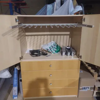 Mueble de oficina con dos cajones, uno de ellos con cerradura. - Cajón superior con tirador metálico. - Cajón inferior con espacio para carpetas colgantes. - Acabado en madera. Disponible desde febrero 2026, por traslado de oficina