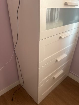 Cómoda de la serie Brimnes de Ikea. Cuenta con un diseño moderno y funcional. - Cajones amplios para almacenamiento. - Acabado en blanco. - Incluye un compartimento con puerta de cristal.