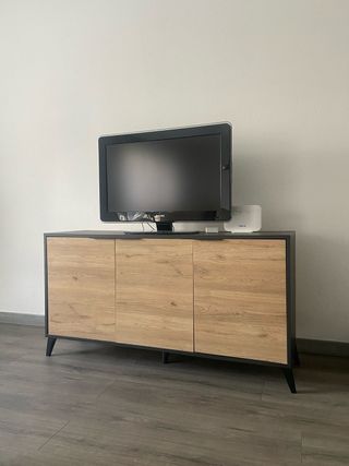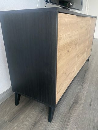 Aparador de diseño moderno con tres puertas y un acabado que combina negro y madera. - Estructura principal en color negro. - Puertas con acabado imitación madera. - Patas metálicas negras. - 136x40x72