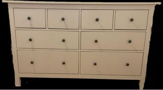 Cómoda de madera con un acabado en tinte blanco y ocho cajones espaciosos. Cómoda Hemnes de Ikea. Medidas cómoda: Ancho 160cm Fondo 50cm Altura 96cm Fondo de cajón (int) 43cm