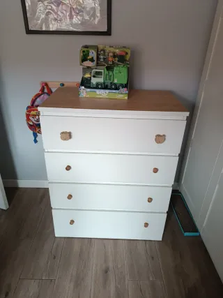 Cómoda de cuatro cajones con un diseño moderno y funcional. - Acabado superior en madera.(De vinilo) - Tiradores con diseño de osito. - en buen estado con alguna marca de su uso normal