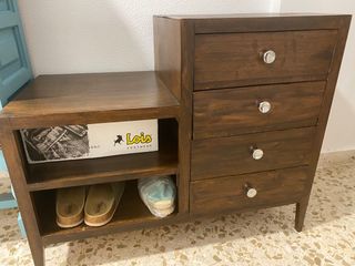 Vendo cómoda de madera en muy buen estado, ideal para dormitorio, salón o entrada. Tiene 4 cajones amplios y una puerta abatible tipo escritorio, perfecta para guardar documentos o usar como pequeño secreter. Medidas: Largo/ancho: 75 cm Alto: 104 cm Fondo: 34 cm Mueble robusto, de estilo clásico y con herrajes decorativos. Perfecto para quien busca una pieza con carácter y buena capacidad de almacenamiento. Recogida en mano.