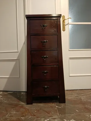 Elegante mueble cajonera con un diseño clásico. - Cinco cajones con tiradores. - Acabado en tono oscuro. Mide de ancho 45 en la parte inferior y 39 en la superior ya que estrecha conforme sube al ser un poco piramidal Los cajones si son todos iguales de 30 de ancho x 15 de alto