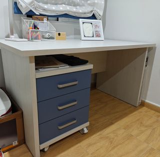 Escritorio completo de buena calidad, ideal para tu espacio de trabajo o estudio. Su diseño moderno y funcional lo hace una excelente adición a cualquier habitación. - Acabado en madera clara y detalles en azul. - Cajonera con tres cajones. - Ruedas para fácil movilidad.