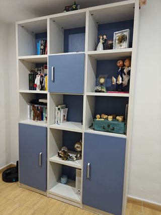 Muy bien cuidado en un estado excelente. Solo se vende por mudanza. Conjunto de muebles de dormitorio en madera clara, ideal para optimizar el espacio. Colchones, cama cajoneras, armarios, estanterías, mesas de estudio - Armario grande con puertas de lamas. - Mueble superior con estantes y puertas. - Estantería abierta. - Armario auxiliar con puertas de lamas.