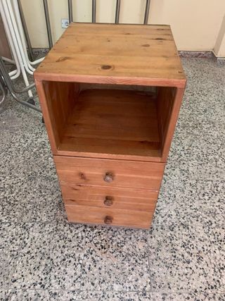 Mesita de noche de madera con tres cajones y tapa de cristal. Cama completa con cabecero de madera de pino cabecero , con largureros colchón 1.35 sumier 1.35 con cajonera incluida. Todo en perfecto estado precio conjunto nada por separado precio no negociable no rebajo no cambios. - Diseño clásico en madera de roble. - Tiradores metálicos ornamentados. - Patas redondeadas.