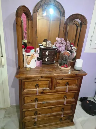 Mueble de madera maciza con un espejo triple. - Diseño rústico y elegante. - Acabado en madera natural. - Ideal para tocador o dormitorio. No se envia.