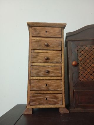 Preciosas cajoneras de madera, ideales para organizar cualquier espacio. Son dos piezas, una con varios cajones pequeños y otra con un cajón y un compartimento con rejilla. Están en buen estado y listas para usar. A una le faltan los tiradores, tengo metálicos dorados pequeños guardado en los cajones - Perfecta para organizar joyería, manualidades o pequeños objetos. - Acabado artesanal con detalles cuidados. - Piezas compactas y fáciles de colocar.