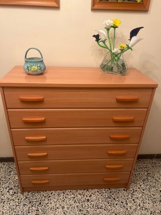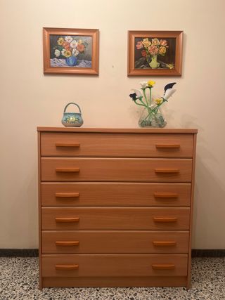 Preciosa cajonera de madera, en color marrón claro. Ideal para dormitorio o cualquier habitación. - Tiene 6 cajones amplios y espaciosos. - Los tiradores son de madera, a juego con el mueble. - Se encuentra en buen estado, lista para usar.