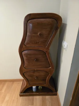 Mueble auxiliar de madera con un diseño único y orgánico. Sus líneas curvas le dan un toque distintivo y elegante. Comoda o cajonera vintage de madera de calidad, en su momento costo 1500€. - Tres cajones amplios. - Base inferior abierta para almacenamiento adicional. - Tiradores integrados en los cajones.