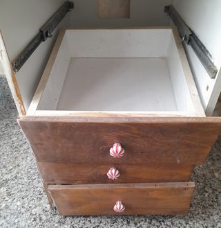 Mueble de 5 cajones,no tiene nada en la parte superior porque estaba debajo de una encimera de granito,las guías de los cajones hay que ajustarlas para poder poner los cajones. 70cm altox40cm ancho x56cm profundo.