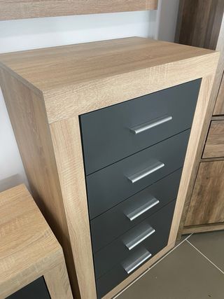 Mueble sinfonier con un diseño moderno y funcional. Hacemos envios - Estructura de madera con detalles en metal. - Cajones de color gris oscuro.
