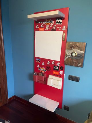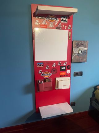 Mueble auxiliar con superficie de pizarra y estantes. - Diseño moderno en color rojo y blanco. - Combinación de materiales plásticos y madera.