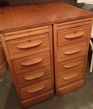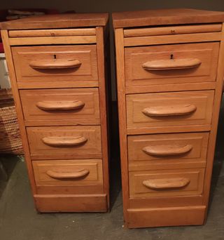 Conjunto de dos cajoneras de roble macizo. Piezas robustas y de gran calidad. - Fabricadas en roble macizo. - Diseño clásico con tiradores curvos. - Una cajonera tiene cuatro cajones. Y otra 3, el de abajo es más profundo. - Son dos cajoneras de gran capacidad. Formaban parte de un escritorio. Tenía un tablero encima que estaba manchado. Con un sistema de cierre en los cajones. Tiene unas manchas en el último cajón. 33x76x68,5cm. De profundidad Cada cajonera.