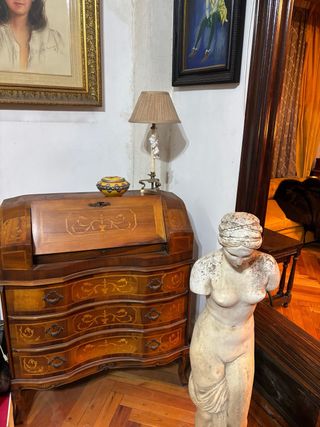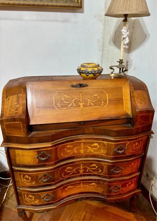 Elegante cómoda de madera con un diseño clásico y detalles decorativos. - Acabado en tonos marrones y dorados. - Cajones con tiradores metálicos. - Encimera de madera con incrustaciones. - Patas de madera talladas.