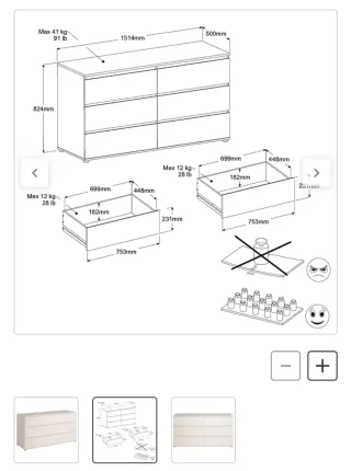 Cómoda de seis cajones completamente nuevo con un diseño moderno. No hay fotos más alla de las publicadas por el vendedor oficial porque nunca se llegó a montar. Venía en dos cajas, una de ellas incluso sigue sin abrir. Dimensiones - Medidas: 151.4 cm de ancho, 82.4 cm de alto y 50 cm de profundidad. - Cada cajón soporta hasta 12 kg (28 lb).
