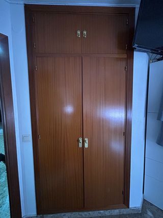 Conjunto de puertas de armario en tono madera, con marco, barra y cajonera. Incluyen los altillos. Tienen varios años y están usados pero no tienen desperfectos. Se pueden venir a ver y os lo entregamos ya desmontados. Solos las puertas son 60€ de cada armario, si es con cajonera 90€
