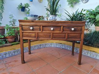 Consola china auténtica con tres cajones debajo de los cuales hay un compartimento de almacenamiento. Conserva la pegatina de importación desde China. Hemos preferido no tocarla desde que llegó a nuestras manos. Los tiradores no son los originales aunque le quedan genial. Es una pieza bellísima, muy funcional y elegante. La madera (pino), está perfectamente sana, y la estructura en perfectas condiciones. Tiene marcas propias de no haber sido valorada en alguna estapa de su larga vida, pero estoy seguro que unas muy buenas manos la esta esperando. Para más información, fotos,etc... no dudes en preguntarme!