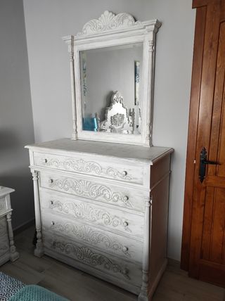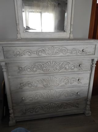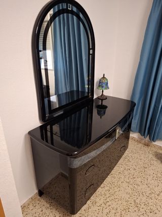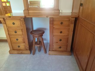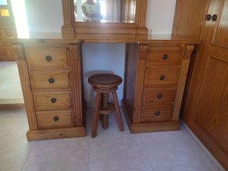 vendo mueble tocador, tamaño grande, cajones con mucha capacidad. medidas: ancho 139 CMS, alto 83 CMS, fondo 54 CMS. Regalo el taburete. El tablero se puede quitar ( tornillos), para transportar más cómodo, serían dos cajonera y tablero. Tallado a mano y hecho a medida.