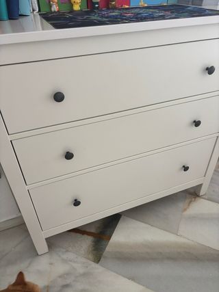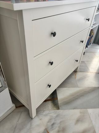 Cómoda blanca de 3 cajones, muy estable y fuerte. Tiene defectos estéticos de pintura visibles (ver fotos). El último cajón tiene la base algo movida, pero abre y cierra y sigue siendo totalmente funcional. Ideal para trastero, habitación infantil o para quien quiera restaurarla. Medidas aproximadas: 90 cm ancho x 45 cm fondo x 82 cm alto. Precio acorde al estado. Recogida en mano