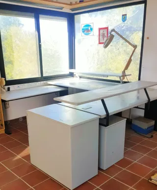 Mesa de gran tamaño, ideal para trabajos de modelismo o como escritorio. - Superficie amplia. - Estructura robusta. fondo frontal 240cm y 80cm ancho y 70cm alto normal con reprisa 94cm el otro lado central son 160cm x80cm y la altura son ,72cm la mesa paralela a la frontl mide 130cm x 60cm xaltura 63 tiene 3 cajoneras con llaves 42 altura y 45 ancho y fondo seria 80cm cada uno con 3 cajones metal y superficie de plastico o vinilo . En cada mesa hay dos huecos tapados para . Tiene una luz incorporada en la mesa central y unos enchufes debajo de la mesa central Se puede comprar tambien solo la mitad porque la mesa frontal puede v