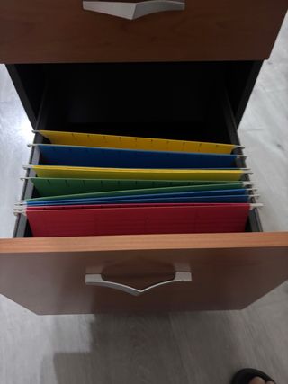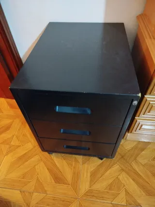 Cajonera de estilo juvenil con un diseño moderno y funcional. Sus ruedas facilitan su movilidad. Uno de los cajones está algo tocado. La parte trasera en la parte superior también. Rueda bien y los cajones abren perfectamente y por dentro están en buen estado.