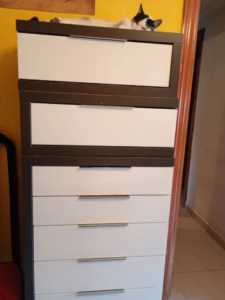 Conjunto de dos cajoneras de armario con un diseño elegante. Las dos cajoneras 70€ y una 40€. - Acabado en madera oscura. - Múltiples cajones para almacenamiento.
