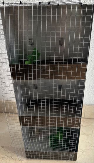 Cajonera de madera con malla metálica, ideal para pájaros. - Construcción en madera. - Paneles de malla para ventilación. - Asa superior para transporte.