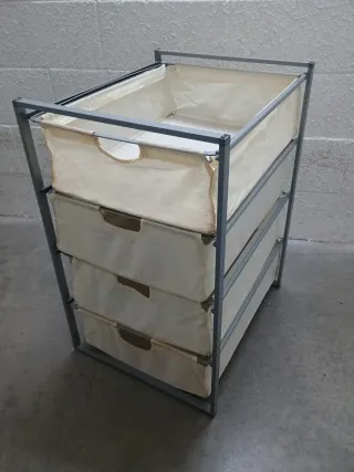Cajonera modular Antonius de IKEA con cuatro cestos de lona. - Estructura metálica. - Cestos de lona con fondo de madera y cerco de metal. - Color beige y gris. - Desmontable y lavable. El sistema Antonius es completamente modular: se puede reutilizar el rack con cajones de plástico o metálicos, instalarle ruedas, ponerle un tablero, montar racks adicionales encima, etc. Actualmente descatalogado, ha sido reemplazado por las cajoneras JONAXEL. Más cositas en mi perfil, hago descuento si compras varias cosas. A recoger en Móstoles, cerca de la estación de Metro Hospital de Móstoles.