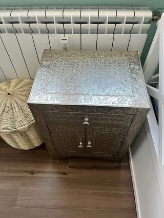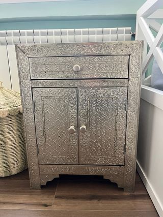 Mueble auxiliar con un diseño muy detallado y elegante. - Acabado metálico con relieve. - Cajón superior y dos puertas inferiores. - Tiradores redondos.