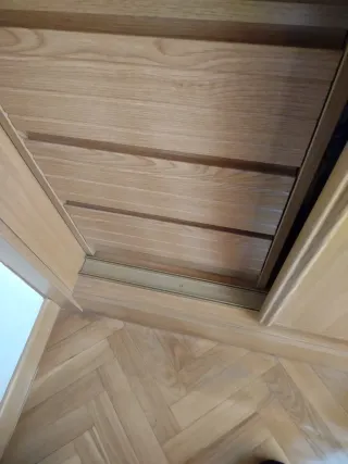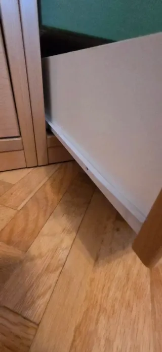 Cajonera efecto madera Tiene un descorchador en el lateral derecho y 2 agujeros de tornillos en el lateral izquierdo Por lo demás está perfecta, los cajones ruedan perfectamente.