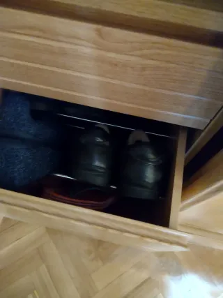 Mueble versátil que puede usarse como cajonera o zapatero. - Diseño de madera con líneas horizontales. - Guías metálicas para cajones o puertas.