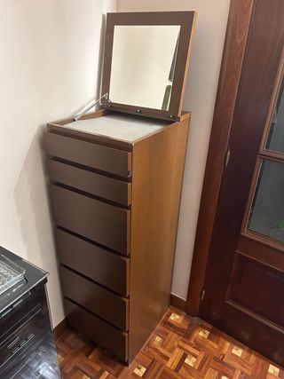 Cómoda alta de seis cajones con espejo abatible. - Acabado en madera de color marrón. - Diseño moderno y funcional. - Las dos esquinas superiores están rozadas del uso. - En tienda 129€.
