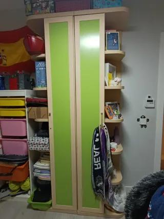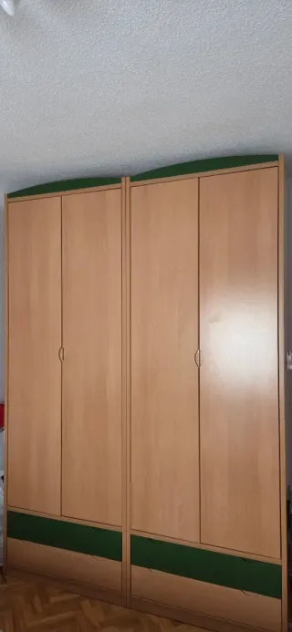 Armario en perfecto estado, seminuevo. - Medidas: 239 cm (alto) x 170 cm (ancho) x 55 cm (fondo). - El alto total es de 243 cm debido al decorado verde, que se puede quitar a la hora de instalar. - Muy bien cuidado, seminuevo. - Cajones con rieles que se deslizan fácilmente. - Fondo de 55 cm, amplio almacenaje, baldas muy duras que aguantan mucho peso. - Se puede ver dentro una cajonera, y que la balda la aguanta sin problemas. - Barras de aluminio que aguantan mucho peso, no se doblan. - Lo vendo por redecorar la habitación. Precio 100€ no negociable. Se tiene que desmontar y recoger, 4° piso sin ascensor.