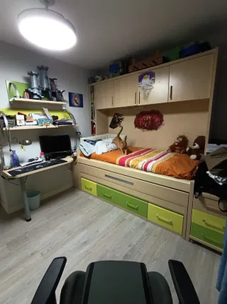 RECOGERLO Y DESMONTARLO EN MI DOMICILIO. Se vende dormitorio juvenil completo. Incluye un armario ropero esquinero que no aparece en las fotos que ya está desmontado. - Cama nido con cajones integrados. - Armario superior con puertas. - Escritorio con estanterías. -Cajonera con 3 cajones y ruedas.